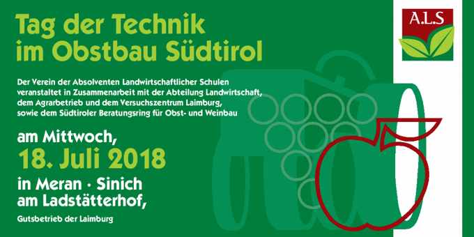 Am 18. Juli, findet am „Ladstätterhof“ in Meran/Sinich, der „Tag der Technik im Obstbau Südtirol“ statt. Der Verein Absolventen Landwirtschaftlicher Schulen stellt hier in Zusammenarbeit mit der Abteilung Landwirtschaft, dem Agrarbetrieb und Versuchszentrum Laimburg und dem Südtiroler Beratungsring für Obst- und Weinbau die neuesten Entwicklungen im Obstbau vor.