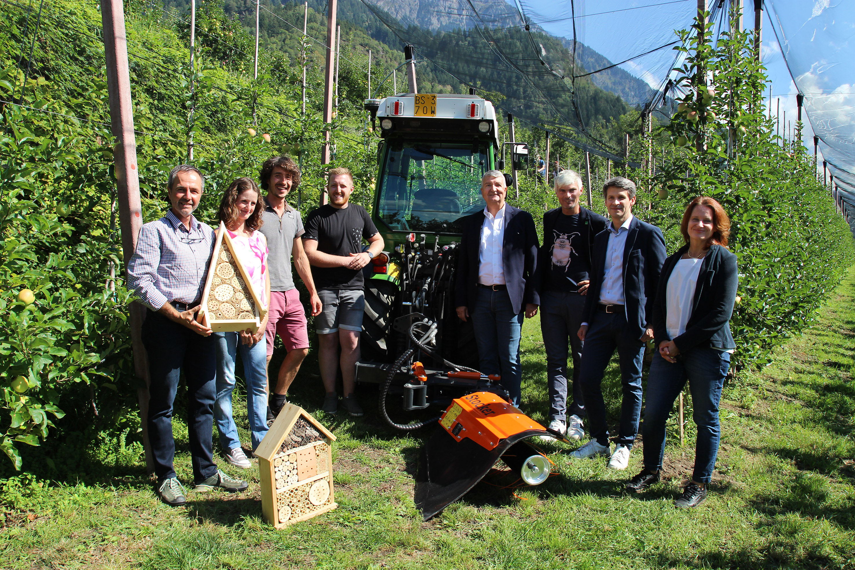 Birnbäume säumen den Wegesrand, Gänse und Enten watscheln durch die Obstreihen und Fledermäuse finden in einem Fledermausnistkasten mit LeD Beleuchtung Unterschlupf. Iris Steck hat auf ihrer Wiese in Partschins viele besondere Landschaftselemente integriert, die einen schonenden und nachhaltigen Obstanbau ermöglichen. „Die Enten und Gänse fressen verschiedenste Schädlinge, die sich gerne in den Wiesen unter den Obstbäumen aufhalten und die Fledermäuse ernähren sich von schädlichen Insekten. Die Tiere sind für uns Obstbauern sehr nützlich und wir können durch ihre Hilfe weniger Pflanzenschutzmittel einsetzen“, erklärt Iris Steck, eine der Gewinnerinnen aus Partschins.