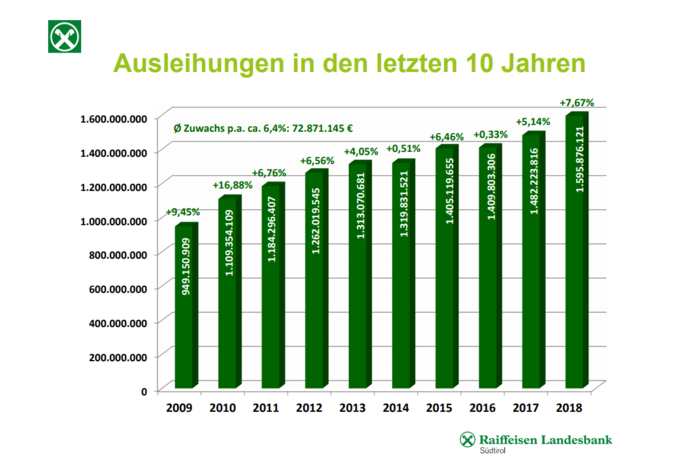 Raiffeisen konzentriert sich auf Südtirol und verschafft den heimischen Unternehmen die Geldmittel für ihre Investitionen. „Der Wirtschaftsmotor in Südtirol lief im letzten Jahr rund. Viele Betriebe haben die Chance genutzt. Die dazu notwendigen Mittel haben wir ihnen, in enger Zusammenarbeit mit den Raiffeisenkassen, zur Verfügung gestellt“, sagt Michael Grüner. Vor allem geförderte Darlehen und Leasingfinanzierungen wurden stark nachgefragt. Mit einer Steigerung von 113,7 Mio. Euro (+7,67%) auf 1.596 Mio. Euro erreichte die Bank das höchste Kreditvolumen seit ihrer Gründung. Dieses nimmt seit über 10 Jahren kontinuierlich zu.