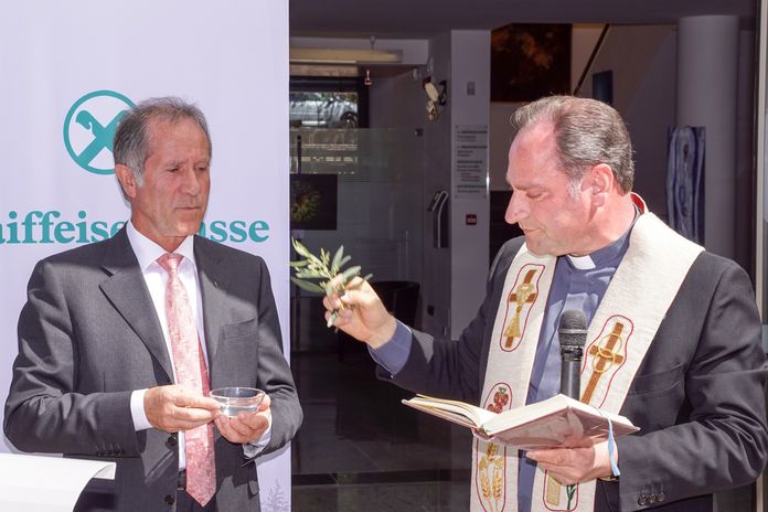 Die Eröffnungsfeier war für den Samstag, 22. April, 11.00 Uhr angesetzt. Bei schönstem Wetter begrüßte Erich Ratschiller, Bürgermeister von Dorf Tirol, Paul Gasser, Generaldirektor des Raiffeisenverbandes und Herbert Von Leon, Obmann des Raiffeisenverbandes Südtirol, die versammelten Mitglieder, Kunden und Geladene. Von Leon lobte die erfolgreiche Geschäftsführung der Raiffeisenkasse Tirol: "Eine neu eröffnete Bank oder - neu gestaltete Bankräume, sind immer auch ein Spiegelbild der einzigartigen und doch beachtenswerten Entwicklung der Raiffeisenkassen insgesamt in unserem Land", so der Obmann und bot eine kurzen Rückblick auf die Geschichte der Raiffeisenkassen in Südtirol. Im Anschluss  daran nahm Pater Edmund Ungerer die feierliche Segnung der neuen Räumlichkeiten vor.