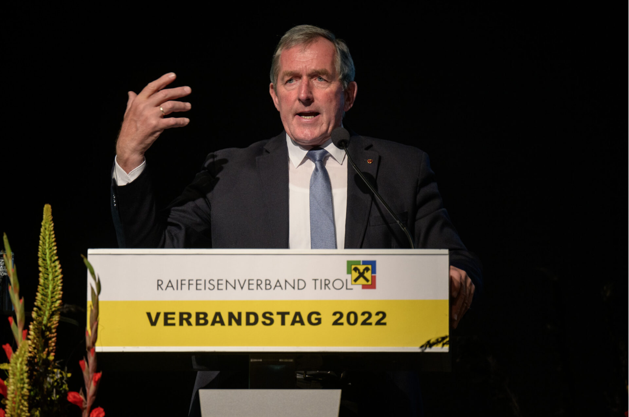 Das Jahr 2021 war ein sehr besonderes und bewegtes Jahr“, sagt Verbandsobmann Hermann Kuenz bei der Eröffnung des Verbandstages des Raiffeisenverbandes Tirol. Voller Hoffnung auf Normalität sei man in das Jahr gestartet, musste aber „ernüchtert feststellen, dass sich Gleichmäßigkeit, Berechenbarkeit und Planbarkeit nicht einstellen wollten“. Flexibilität stand weiter auf der Tagesordnung.