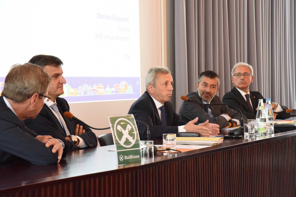 Sergio Gatti, Generaldirektor der Federcasse (Italienischer Zentralverband der Raiffeisenkassen Italiens) skizzierte die Schritte zur Bildung der nationalen Bankengruppen im Rahmen der Reform der italienischen Genossenschaftsbanken. Ebenso erläuterte er das Positionspapier von Federcasse zu den Durchführungsbestimmungen der Banca d’Italia, die im Oktober veröffentlicht werden sollen. Dabei verwies er vor allem auf die Berücksichtigung des genossenschaftlichen Mutualitätsprinzips in den zukünftigen Geschäftsmodellen der Bankengruppe, was im neuen Einheitstext der Banken entsprechend gesetzlich verankert werden konnte. Ziel der genossenschaftlichen Bankengruppe sei es, die kleinen Genossenschaftsbanken wettbewerbsfähiger zu machen und sie in ihrer Geschäftstätigkeit zu stärken, meinte Gatti. Die äußeren Rahmenbedingungen zwingen dazu, auch das genossenschaftliche Bankgeschäft neu zu interpretieren und neu auszurichten.