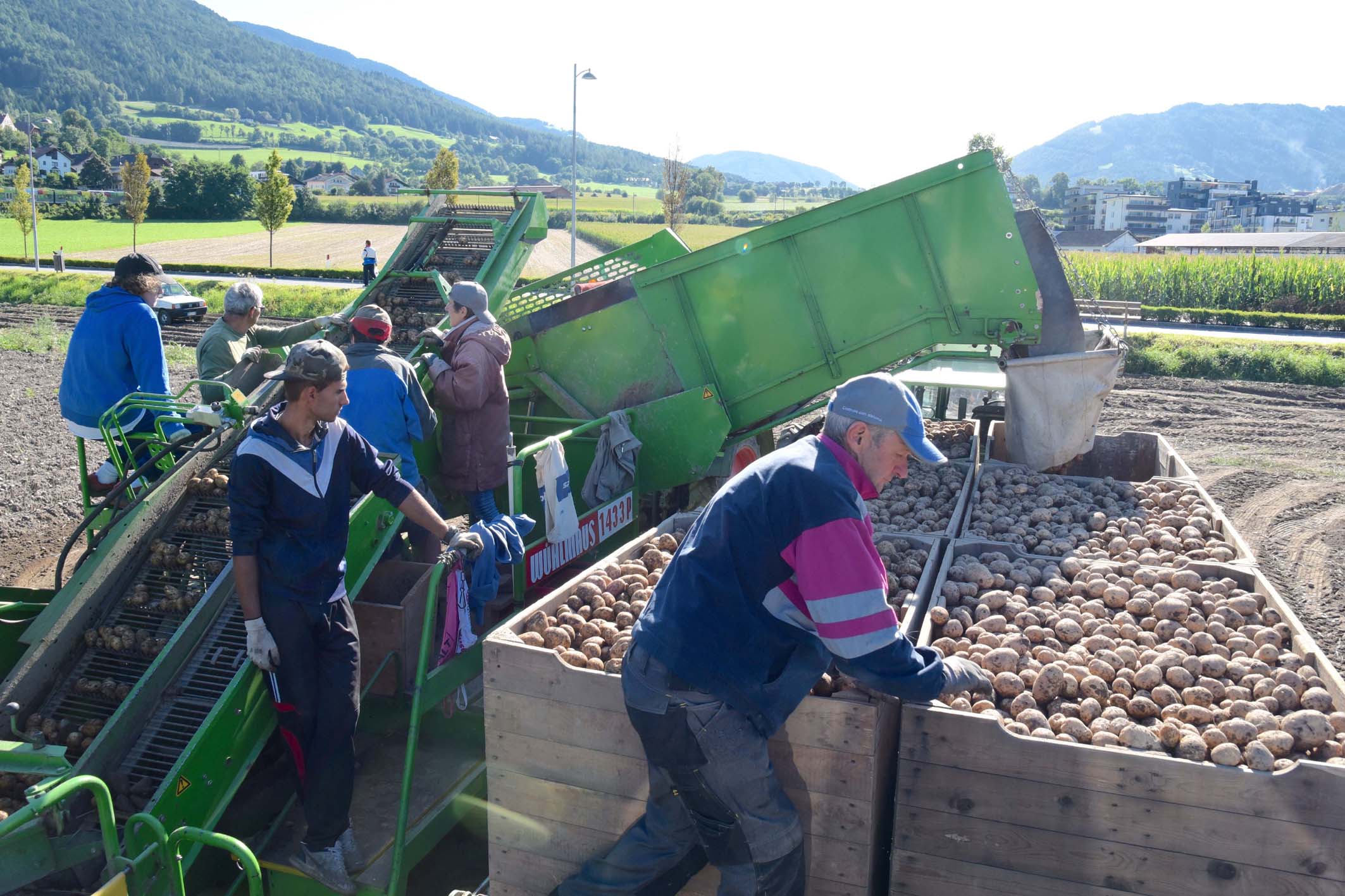 In der Saatbaugenossenschaft herrscht Hochbetrieb. Täglich liefern die Bauern frisch geerntete Kartoffeln in 1000-Kilogramm-Kisten an, heuer erstmals auch rotfleischige Kartoffeln und Süßkartoffeln. Felder rechnet gegenüber dem Vorjahr mit einer etwas kleineren Menge um die 6000 Tonnen, denn wegen der kalten Frühjahrstemperaturen fallen die Knollen etwas kleiner aus. In der Saatbau werden die Kartoffeln schrittweise heruntergekühlt und vor dem Verkauf über eine raffinierte Verarbeitungskette geschickt: zuerst bürsten, nach Größen sortieren, in riesigen Behältern bunkern und von dort aus über Waagschalen als Saat- oder Speisekartoffeln in Papiertaschen, Rastel- oder Jutesäcken verpacken.