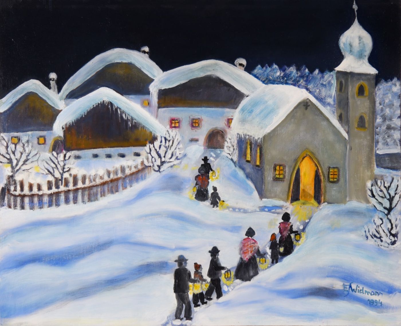 Das Motiv der Raiffeisen-Weihnachtskarte mit dem Titel "Die Heilige Nacht" stammt von der 1928 in Bozen geborenen Künstlerin Erika Scrinzi-Widmann, die seit den 70er Jahren künstlerisch tätig ist. Sie malt gerne Natur- und Landschaftsmotive in Mischtechnik mit Öl und Akril auf vorpreparierten Holztafeln.