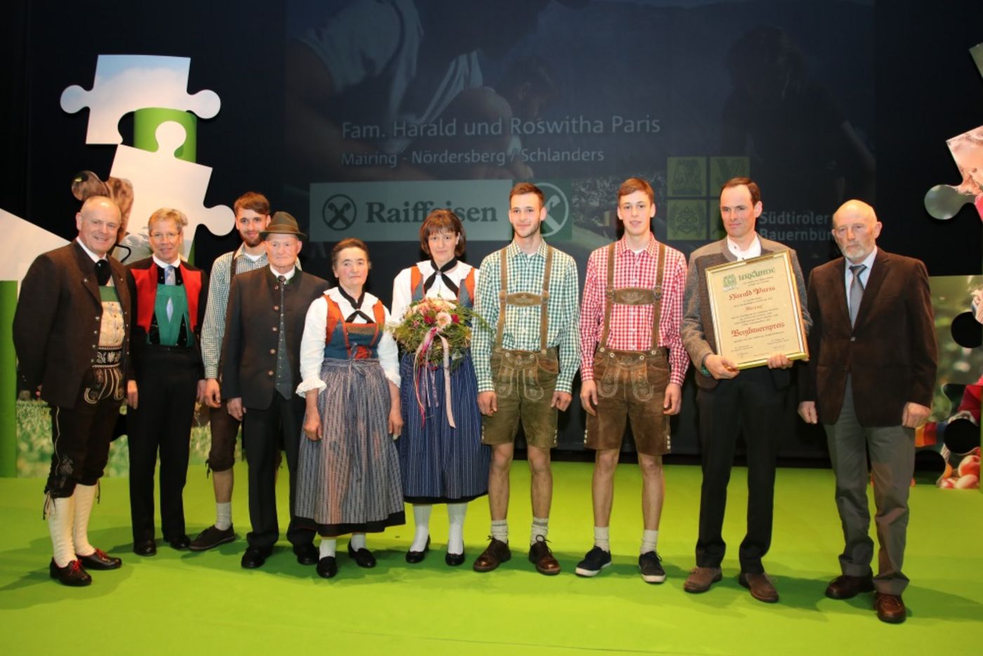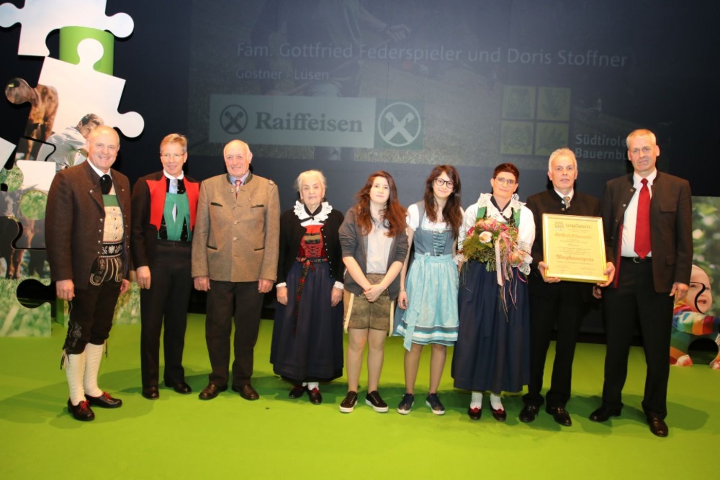 Jedes Jahr werden auf der Landesversammlung des Südtiroler Bauernbundes drei Bergbauernfamilien für ihren Einsatz auf den Höfen und die Pflege der Südtiroler Kulturlandschaft mit dem Bergbauernpreis ausgezeichnet. Der Preis wird vom Raiffeisenverband Südtirol gestiftet.