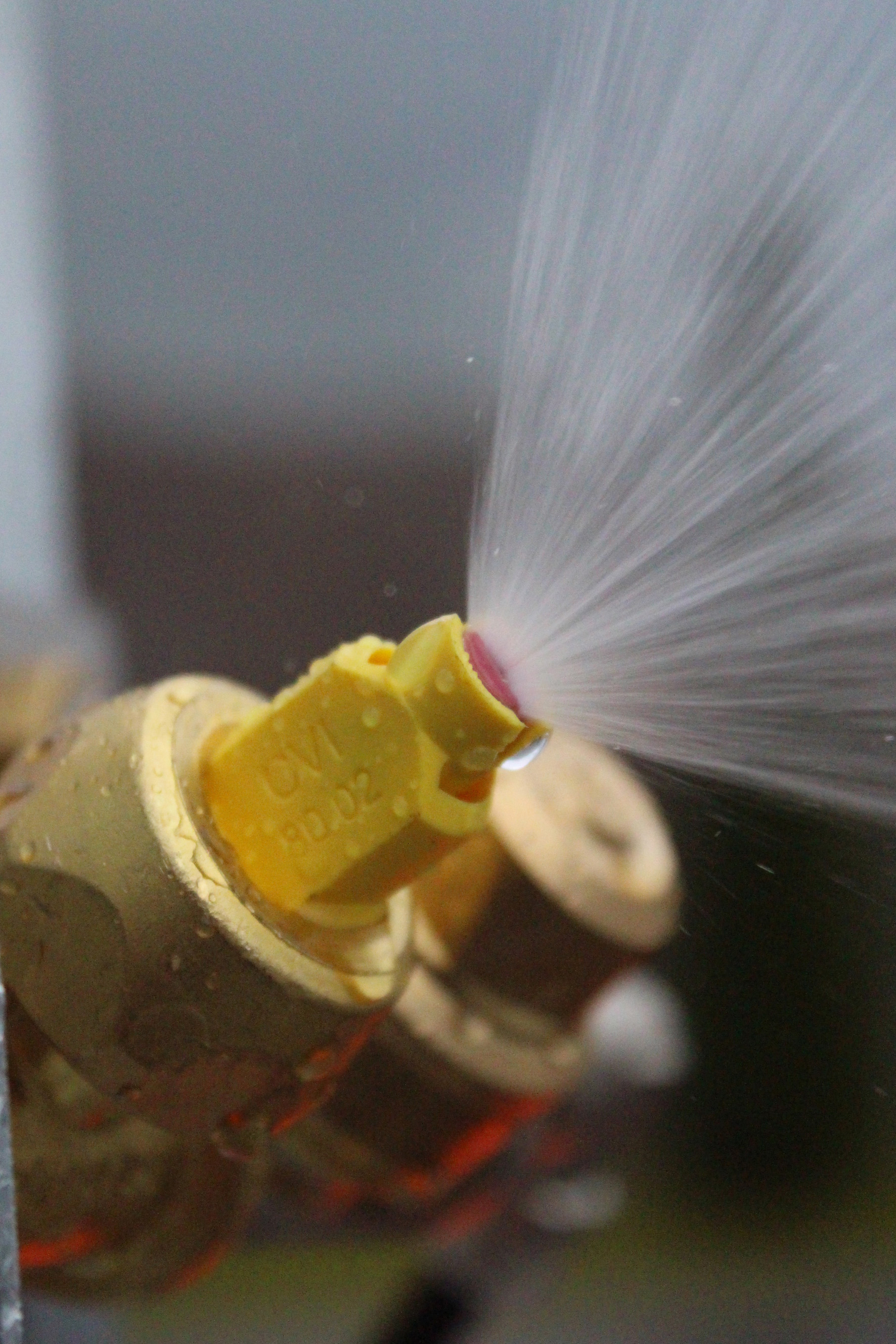 Im Vinschgau ist die Umstellung besonders hoch. Hier kommt die verlustarme Technik bereits auf 85 Prozent der Anbaufläche zum Einsatz. Über 75 Prozent der Obstbauern haben ihr Gerät umgerüstet bzw. ausgetauscht. Die sogenannten Injektordüsen, die neben Abdeckblechen auf die Geräte montiert werden, versprühen größere Tropfen, die weniger stark vom Wind verweht werden, als die bisher eingesetzten Hohlkegeldüsen. Deutlich weniger Abdrift ist die Folge.