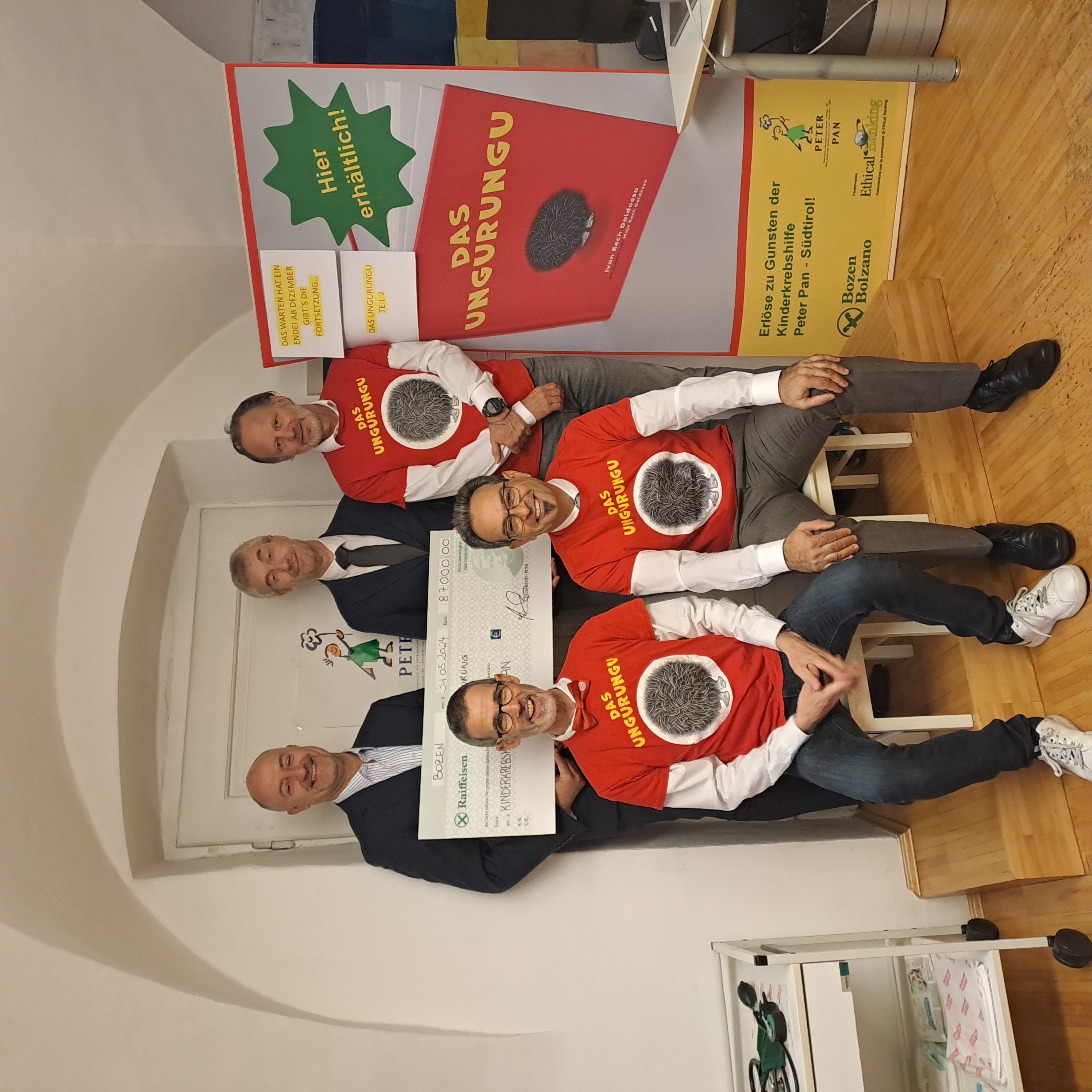 Kinderbuchautor Ivan Rech Daldosso und Roland Furgler von Raiffeisen Ethical Banking sowie der Obmann der Raiffeisenkasse Bozen, Alexander Gasser, und Direktor Günter Mair übergaben die gesammelten 87.000 Euro an Peter-Pan-Präsident Michael Mayr.