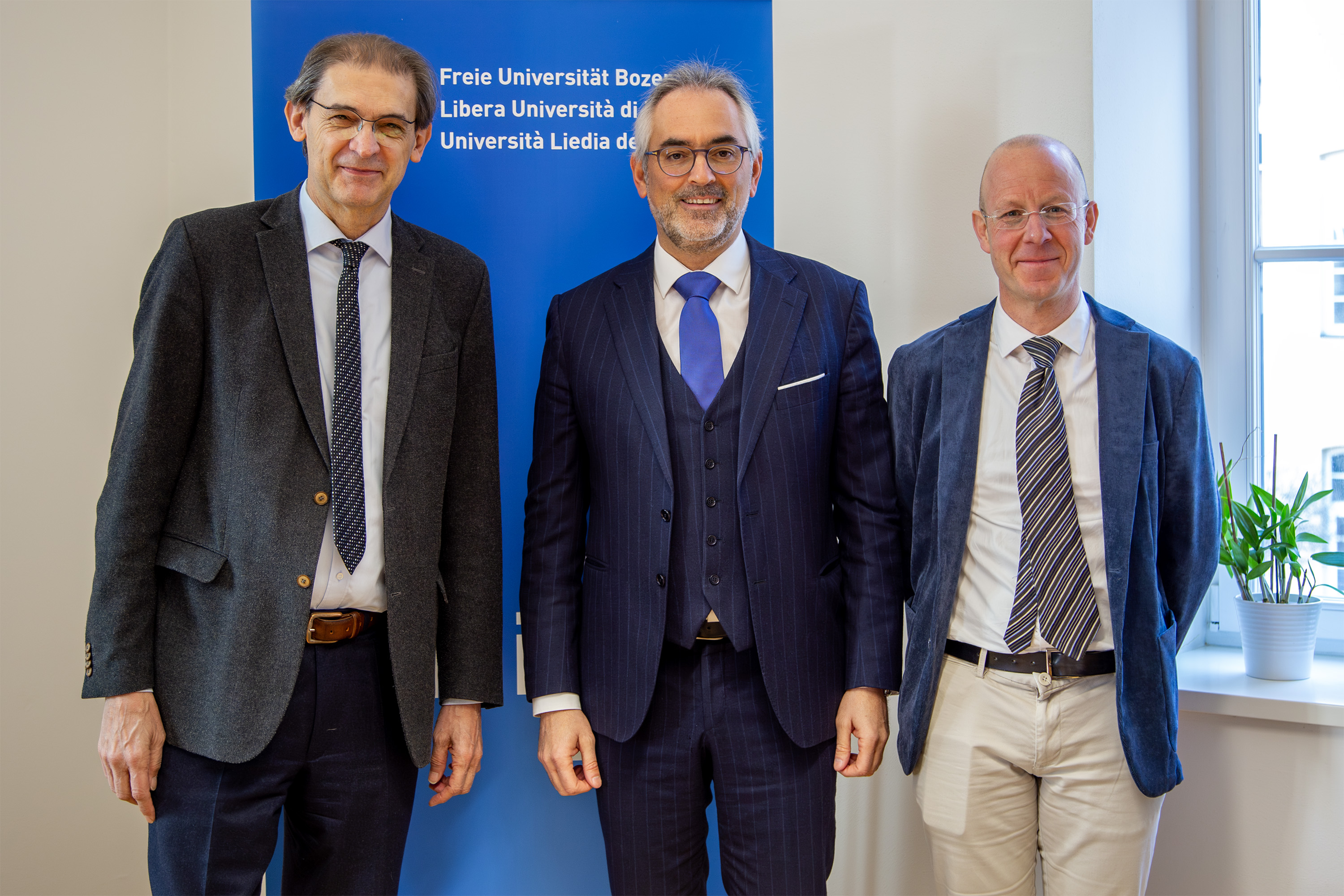 Am Dienstag fand an der Freien Universität Bozen ein Treffen zwischen Robert Zampieri, Generaldirektor des Raiffeisenverbandes Südtirol, Rektor Prof. Paolo Lugli und dem Prorektor für Lehre Prof. Alex Weissensteiner statt, um das Abkommen für gemeinsame Projekte und Ausbildungsmöglichkeitender beiden Institutionen zu unterzeichnen. „Als Universität haben wir großes Interesse daran, mit dem Raiffeisenverband Südtirol auf verschiedenen Ebenen zusammenzuarbeiten und im Rahmen dieser Vereinbarung Synergien zu schaffen, die sowohl in Hinblick auf die Lehre und Forschung als auch auf die Entwicklung des Territoriums Vorteile mit sich bringen“, erklärte Prof. Paolo Lugli.