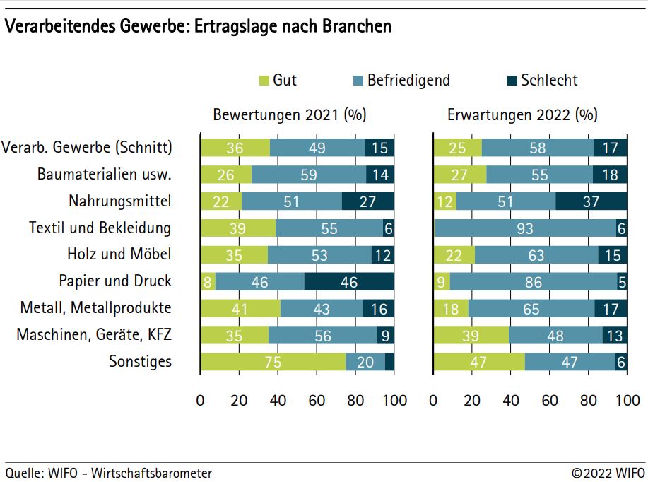 Die Sommerausgabe des Wirtschaftsbarometers zeigt aber eine Verschlechterung der Erwartungen der Unternehmen zur Ertragslage im laufenden Jahr. Der Grund dafür ist die Teuerung der Energie- und Rohstoffpreise und die kriegsbedingte Ungewissheit über die wirtschaftliche Entwicklung. Trotz der generellen Steigerung der Verkaufspreise, die von den Unternehmen vollzogen wurde, um die höheren Kosten zu bewältigen, befürchtet heuer fast ein Fünftel der Befragten ein unbefriedigendes Betriebsergebnis zu erwirtschaften.