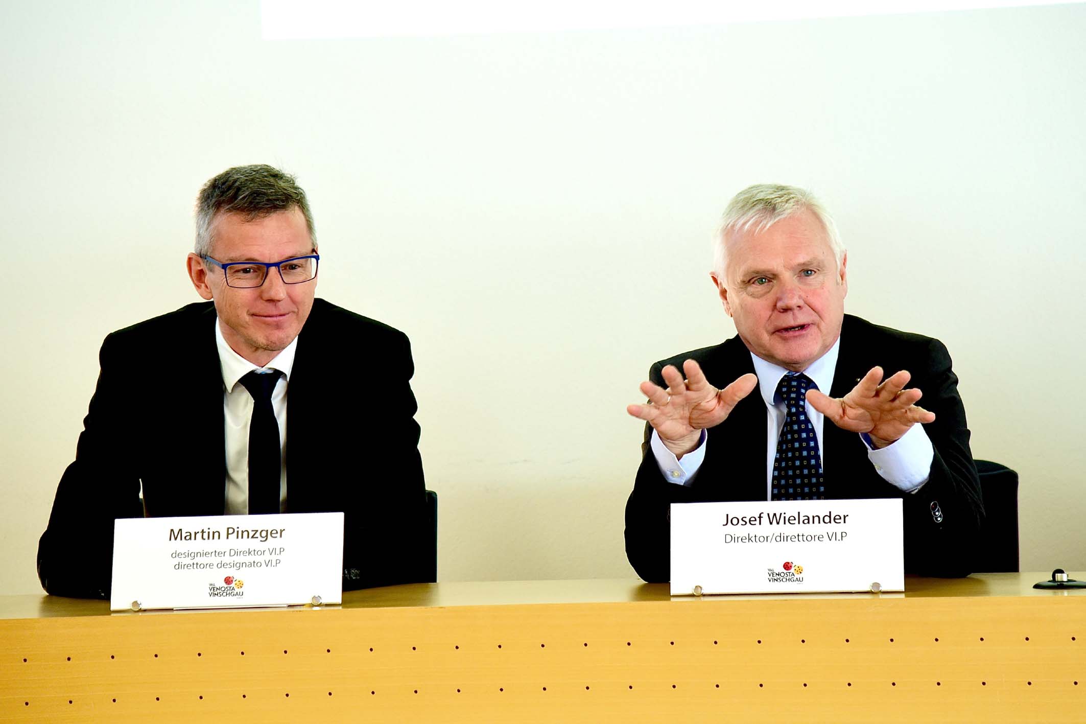 Beim Verband der Vinschger Produzenten für Obst und Gemüse VI.P steht ein Wechsel an der Führungsspitze an: Josef Wielander tritt nach 43 Jahren als führende und treibende Persönlichkeit der Vinschger Obstwirtschaft in den Ruhestand. Sein designierter Nachfolger als Direktor der VI.P ist Martin Pinzger, der bisherige Geschäftsführer der Obstgenossenschaft Mivor.
