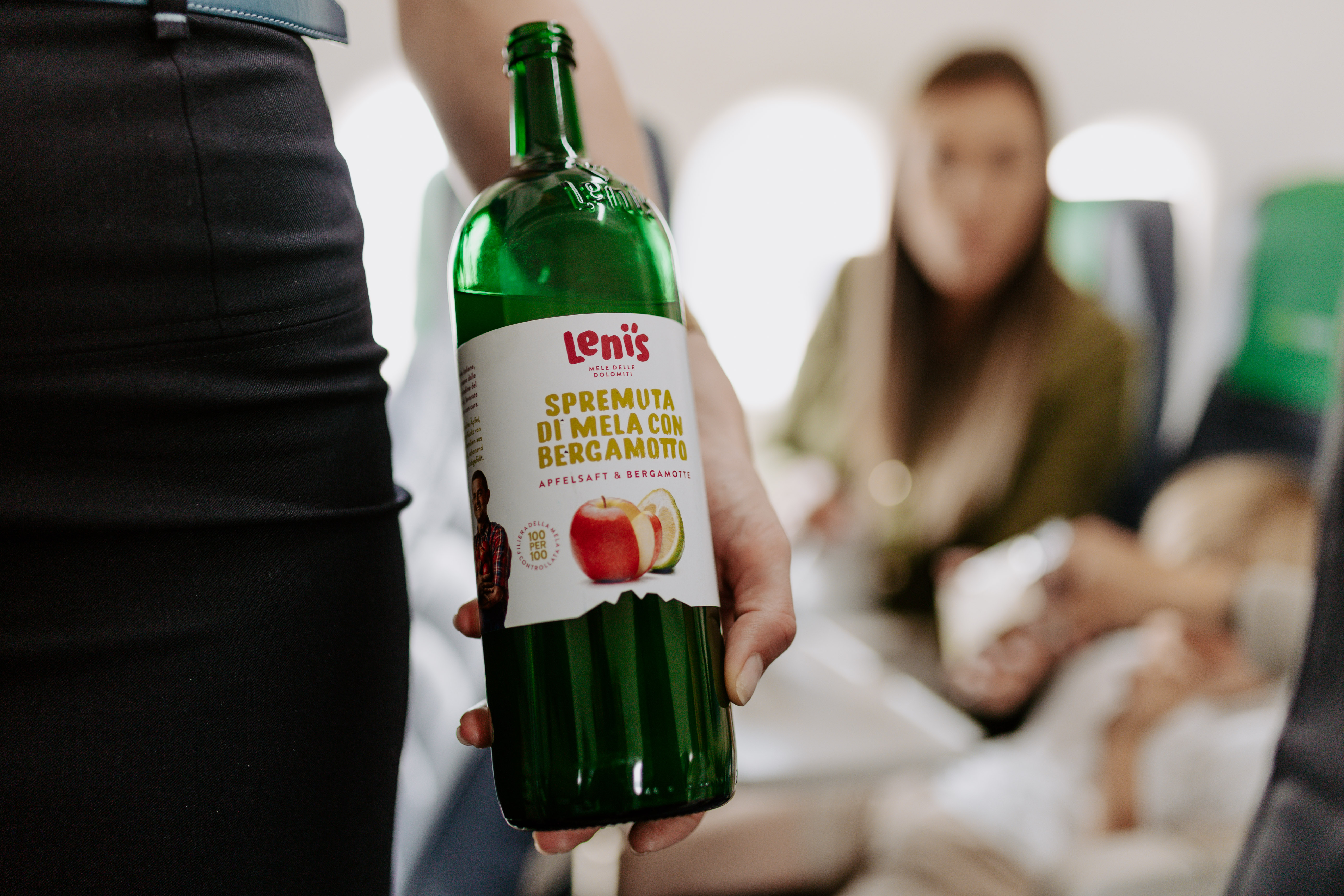 VOG Products stellt vier verschiedene Leni‘s 1Liter-Säfte (Apfel, Apfel-Bergamotte, Apfel-Ingwer, Apfel-Holunder) zur Verfügung, die nun an Bord der Flugzeuge sowie am Flughafen den Gästen serviert werden. Darüber hinaus wird die Marke der Erzeugerorganisation, hinter der die Südtiroler Obstgenossenschaften sowie VOG und VIP stehen, auf den Social Media-Kanälen und am Flughafen Bozen beworben.