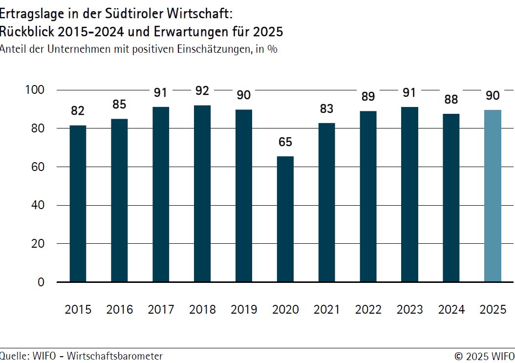 Das Geschäftsklima in Südtirol hat sich im letzten Quartal 2024 leicht verschlechtert, insgesamt bewerten aber 88 Prozent der Unternehmerinnen und Unternehmer die Ertragslage im vergangenen Jahr weiterhin als befriedigend. Das Umsatzwachstum war hauptsächlich auf höhere Verkaufspreise zurückzuführen und betraf vor allem die größeren Unternehmen. Was die einzelnen Wirtschaftssektoren betrifft, so stagnierte das Geschäftsvolumen im Verarbeitenden Gewerbe, im Bausektor und im Handel, während es im Verkehrswesen, im Tourismus und bei den Dienstleistungen leicht zunahm. Die Produktionskosten sind gestiegen, was unter anderem auf die höheren Energiepreise der letzten Monate zurückzuführen ist. Der Arbeitsmarkt entwickelte sich weiterhin positiv: 2024 gab es in Südtirol durchschnittlich über 230.000 Arbeitnehmer*innen, was einem Anstieg von 1,7 Prozent gegenüber dem Vorjahr entspricht.