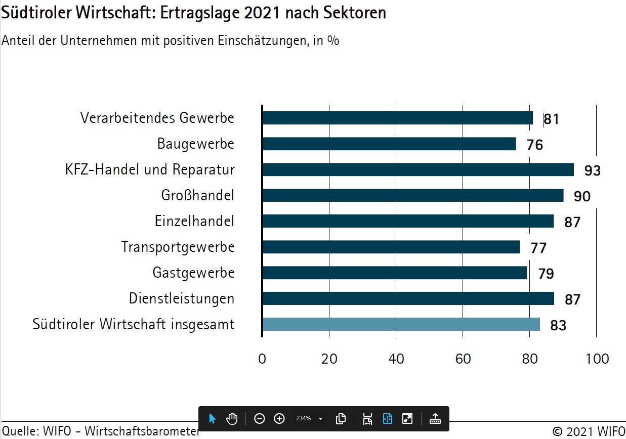 Die Verbesserung des Geschäftsklimas, die sich zu Beginn des Sommers abgezeichnet hat, bestätigte sich in den folgenden Monaten. Dies geht aus der Herbstumfrage des WIFO-Wirtschaftsbarometers hervor. 83 Prozent der Südtiroler Unternehmen erwarten heuer eine zumindest „befriedigende“ (29 Prozent sogar eine „gute“) Ertragslage und 92 Prozent äußerten zuversichtliche Erwartungen für die Ertragslage im Jahr 2022.