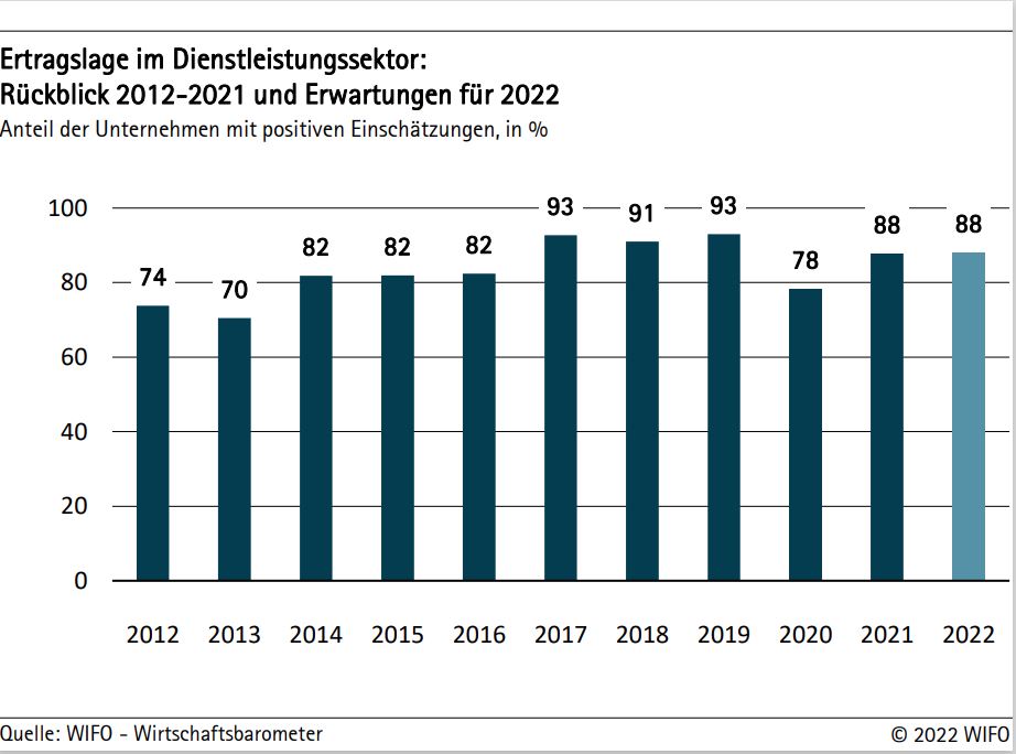 Wie das WIFO – Institut für Wirtschaftsforschung der Handelskammer Bozen bekannt gibt, sind 88 Prozent der Unternehmen im Dienstleistungssektor mit der Ertragslage zufrieden. Etwa sechs von zehn Unternehmen erwarten eine Umsatzsteigerung gegenüber dem Vorjahr, insbesondere auf dem Südtiroler und dem italienischen Markt. Zwischen Jänner und April lagen die Umsätze um durchschnittlich zehn Prozent über dem Vorjahreszeitraum, was zum Teil auf die höheren Verkaufspreise zurückzuführen ist. Den Unternehmen zufolge werden auch die Investitionen gegenüber dem Jahr 2021 steigen. Die Zahl der unselbständig Beschäftigten im Dienstleistungssektor lag zwischen Jänner und Juli um 4 Prozent über dem Vorjahresniveau und die Unternehmen erwarten weitere Personaleinstellungen.