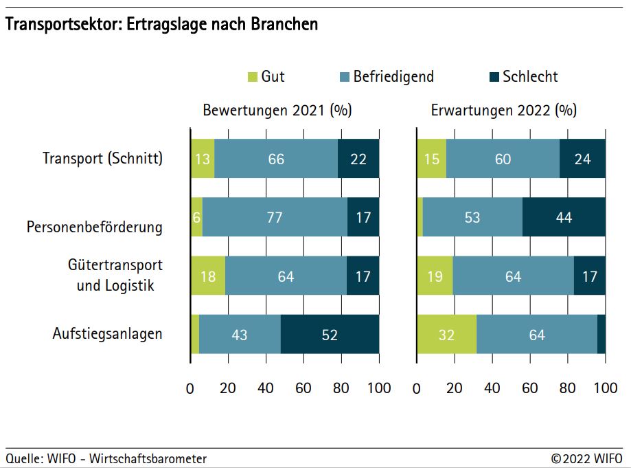 Im Transportgewerbe hat der Aufschwung des Tourismus zu einer Verbesserung des Geschäftsklimas bei den Liftanlagenbetreibern geführt, die jedoch einen starken Anstieg der Betriebskosten für das laufende Jahr beklagen. Die Erwartungen im Güter- und vor allem im Personenverkehr sind verhalten. Diese Branchen sind trotz steigender Umsätze im ersten Halbjahr stark vom Anstieg der Kraftstoffpreise betroffen und melden zudem Schwierigkeiten, Fahrpersonal zu finden. Die Ungewissheit über die Auswirkungen der Inflation auf die Wirtschaftstätigkeit und den Tourismus in der zweiten Jahreshälfte trägt ebenfalls dazu bei, dass das Geschäftsklima schwindet. So glauben 17 Prozent der Unternehmen im Güterverkehr und 44 Prozent im Personenverkehr, dass das Betriebsergebnis heuer unbefriedigend sein wird.