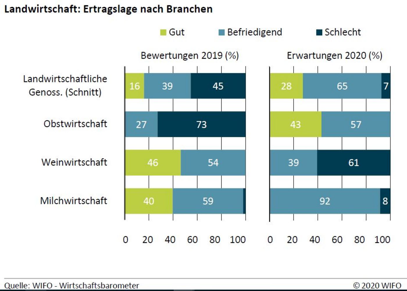 Die aktuelle Sommerumfrage des WIFO – Institut für Wirtschaftsforschung der Handelskammer Bozen untersucht die Auswirkungen der Corona-Krise auf die Landwirtschaft. Laut Umfrage hat es den Weinsektor besonders hart getroffen. Besseres Geschäftsklima hingegen im Milchsektor und bei den Obstgenossenschaften.